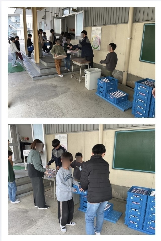 本日給食後の返却の時、いつものように給食委員の皆さんが運ばれてくる食器や牛乳の空箱を受け取って整理してくれていました。その横でちっちゃいお手伝いさんがお兄さんと一緒に片付けていました。委員会の皆さんも、お手伝いさんもありがとうございました。