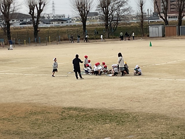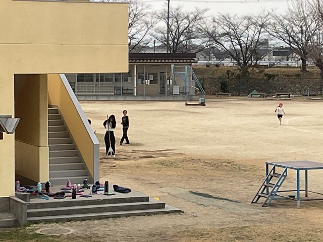 本日3時間目、1年1組が運動場のトラックで持久走に取り組んでいました。強い気持ちで頑張って走っている向こう側では、6年2組がお世話になった船橋小学校への恩返しということで、砂場や運動場の整地に励んでくれていました。