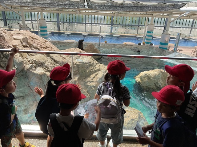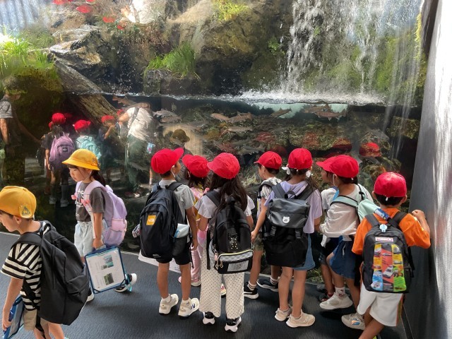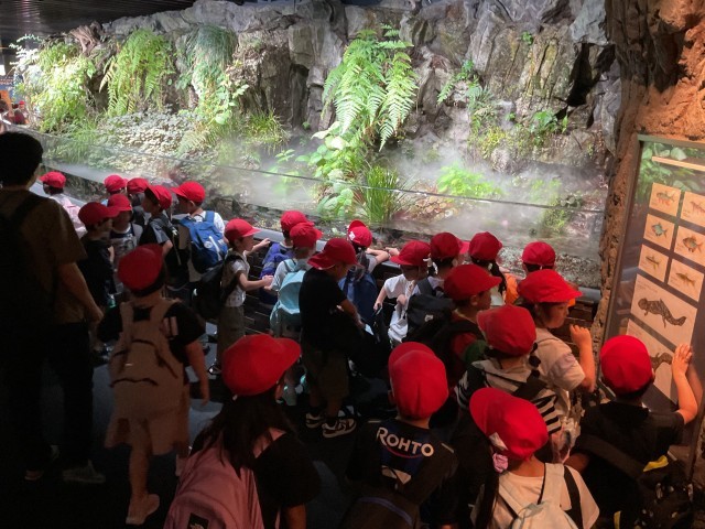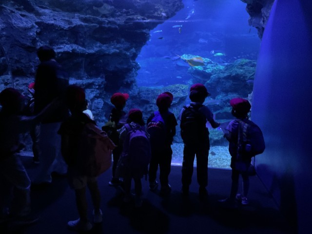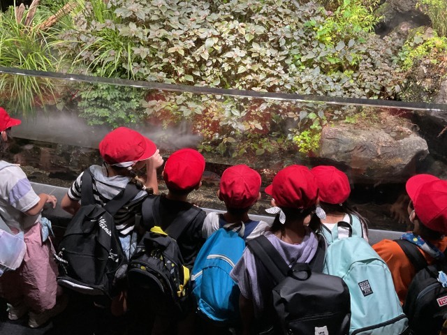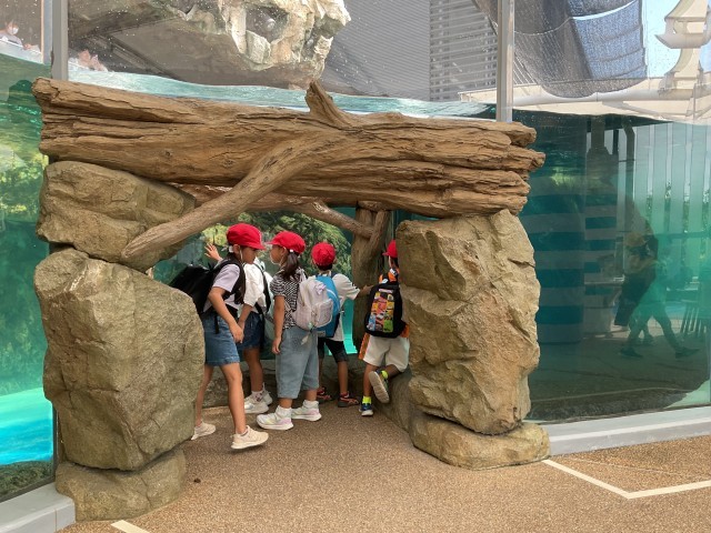 水槽の前では、大きな魚や色鮮やかな魚に釘付けになっていました。一周では物足りず、二周、三周と見にいく児童も大勢いました。