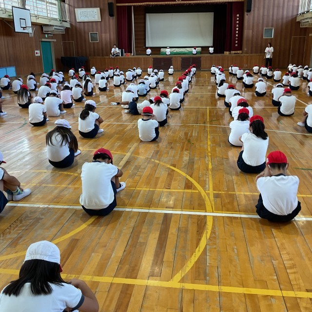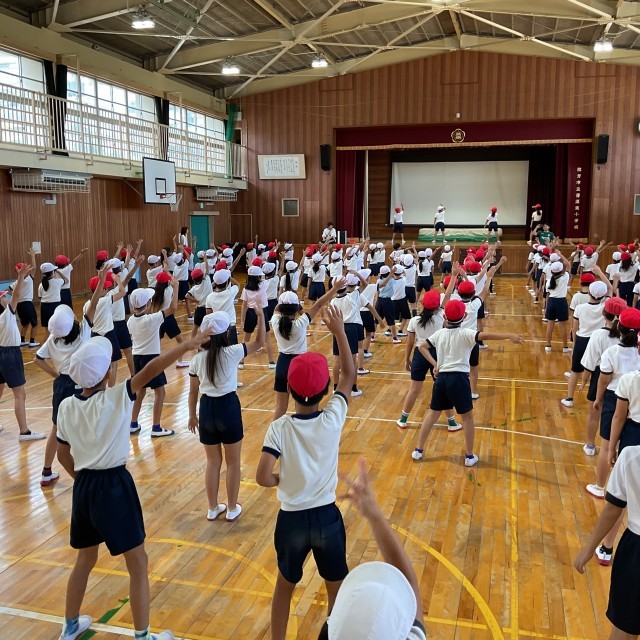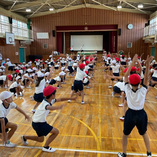 3年生の運動会の準備の様子です。見せ場はなんといってもストンプ(足踏み)で大きな音を出す場面です。体育館では、その音が良い大きく響き渡ります。約170人の児童のストンプは、運動会でもきっと迫力満点になるでしょう。