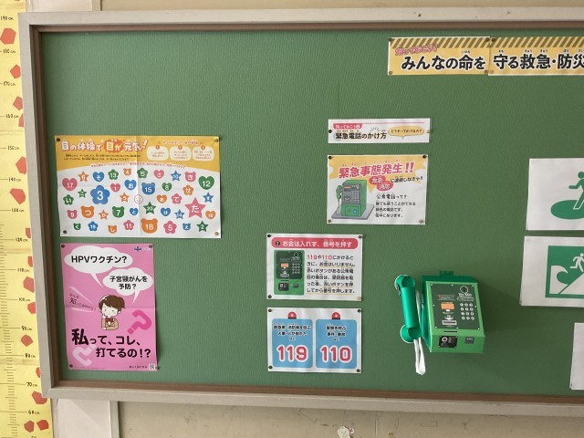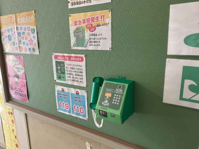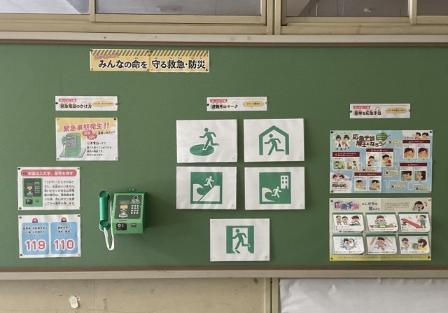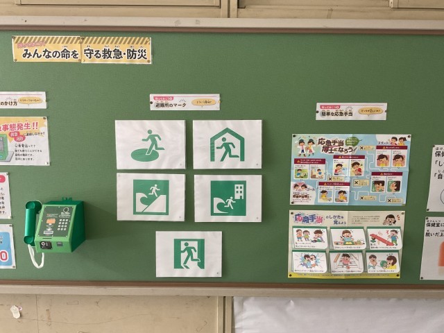 保健室前の掲示物が新しくなりました。今回のテーマは救急・防災です。今回も、児童が思わず立ち止まって見てしまうような、素晴らしい掲示物が用意されました。特に、公衆電話は、ほとんどの児童が使ったことがなく、みんな興味津々でした。