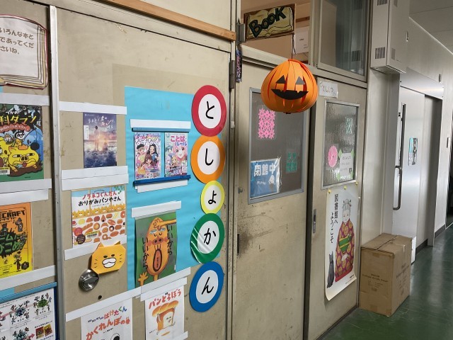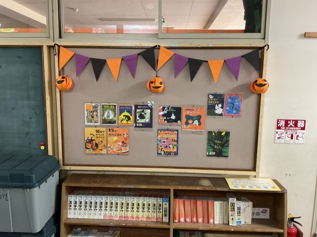図書室前の掲示板も定期的に掲示物が更新されています。現在は、ハロウィン仕様になっています。今年度から司書さんが常駐することになり、図書室内も雰囲気が大きく変わってきました。利用者数も増えているようで、休み時間に図書室のスタンプカードを校長室で見せてくれる児童も昨年より増えている感じがします。読書を通じて、多くのことに興味・関心を持ってくれる児童が増えることを願っています。