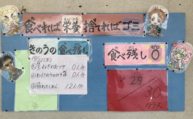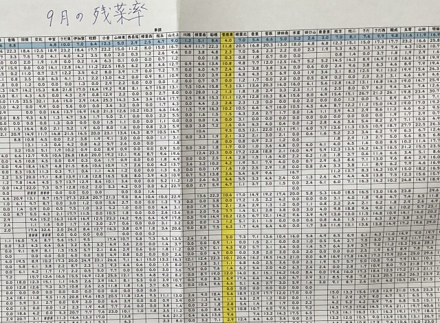 毎回、今日の給食と明日の献立に加えて食べ残しの量についてお知らせしています。食べ残しの量だけではそれが多いのか少ないのか分かりづらいので、9月の残菜率をお示しします。見にくいですが、枚方市の44小学校の中で、本校の残菜率の低さはトップクラスです。これは各家庭でのご指導と調理場・教職員による食育指導の賜物だと思います。これからも子どもたちにはおいしい給食をしっかり食べてもらって、逞しく育ってくれることを願っています。