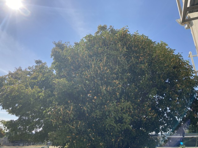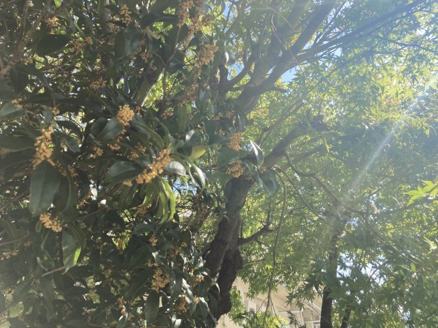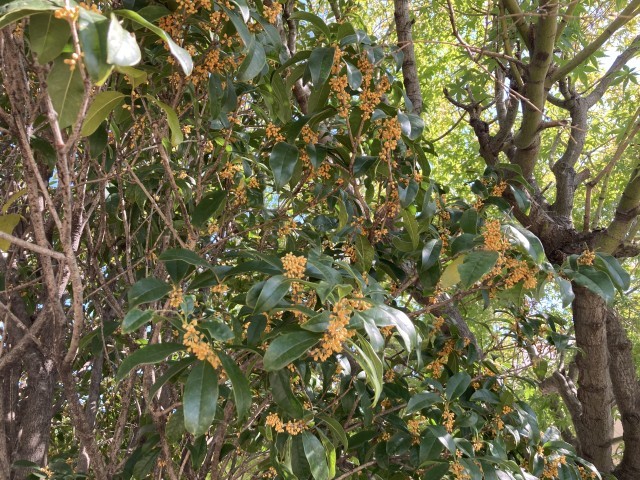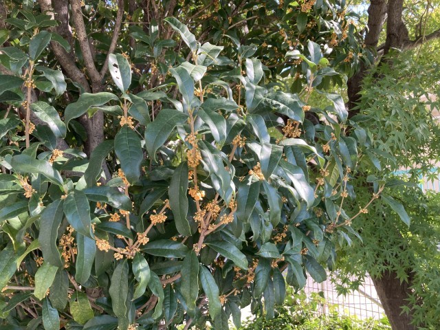 体育館入り口付近に行くと、どこからか甘い香りが。少し時期が遅い感じもしますが、金木犀の香りです。気温が高い年は、開花が遅くなることがあるようです。良い気分転換になりました。