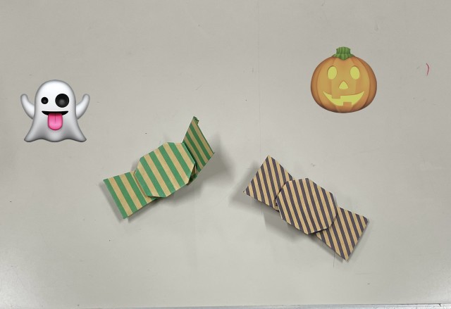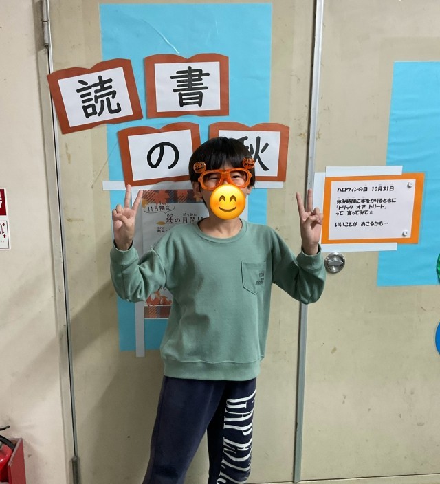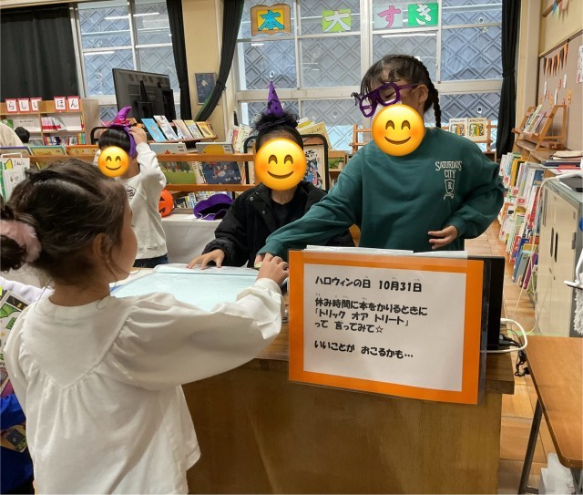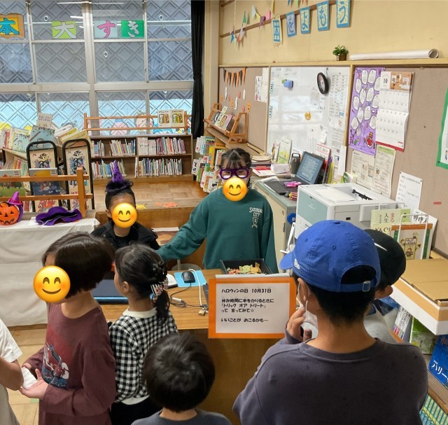 今日はハロウィン。朝から大勢の児童が”Trick or treat!!”と口々に言ってきます。英語の授業では、ハロウィンにちなんだゲームをしていました。図書室では少し前から掲示物がハロウィン仕様になっていましたが、今日は『本を借りると良いことがあるかも』という日でした。本を借りるときに”Trick or treat!”と言うと、折り紙で作った飴玉をもらえるのです。そのせいか、いつもより大勢の児童が来室していました。来週からは新しい図書室企画が始まる予定です。