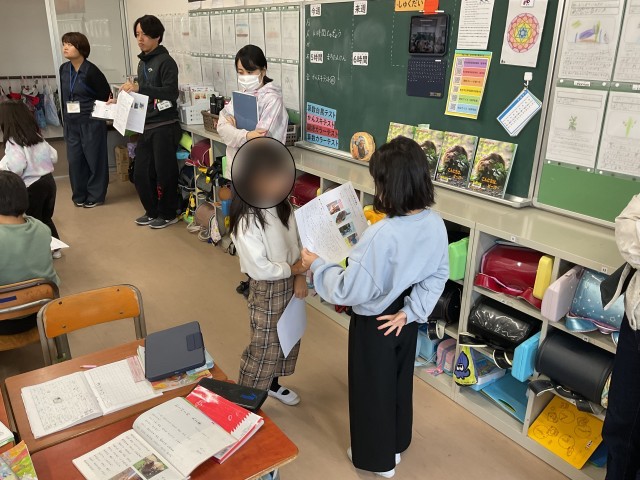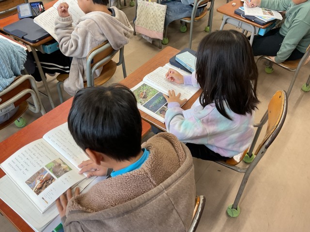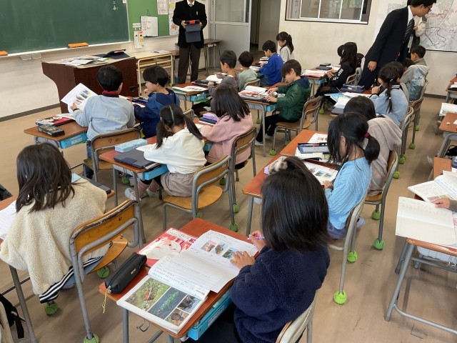 今日は2年2組の研究授業があり、教育委員会からも2名、来校いただきました。子どもたちはいつもより緊張してるかな、という感じで授業が始まりましたが、途中から活発な意見が出るようになりました。国語の授業でビーバーの秘密に関する話でしたが、教科書に書かれていることを各班で話し合いました。その後は、自由に立ち歩いて、自分がまとめた内容を他の児童に伝えました。