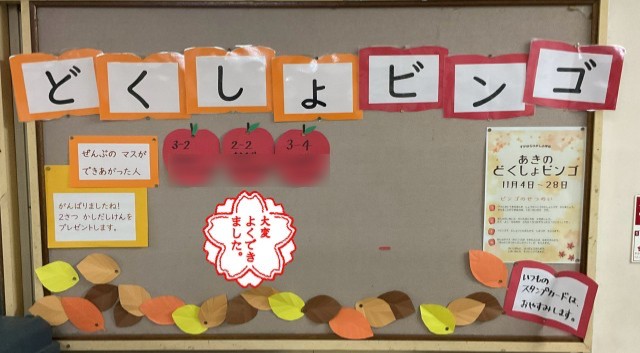 図書室で秋の月間ビンゴが今月28日まで開催されています。今日、ついにビンゴ達成者が3名、誕生しました。そのうちの1人は、先週からあと一冊だと言っていましたが、今日、ビンゴを達成すると校長室まで報告に来てくれました。ビンゴ達成のプレゼントは二冊貸出券。一度に二冊借りられることは、子どもたちにとって特別なことのようで、その券をとても嬉しそうに見せてくれました。このような取り組みを通じて、図書室への来室者が増え、読書の習慣が定着することを願っています。