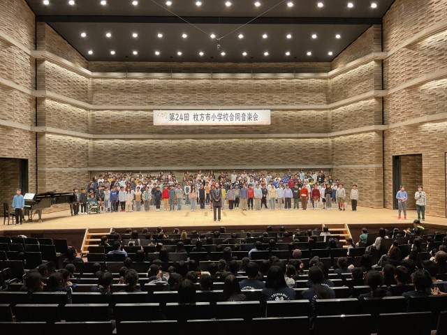 4年生が、枚方市総合文化芸術センター大ホールで開催された枚方市小学校合同音楽会に参加しました。大きく立派な会場で緊張した様子でしたが、『Can do〜君が輝くとき〜』『この街が好き』の二曲を元気よく歌い切りました。練習よりもはるかに素晴らしい歌声だったのは、会場のおかげだけではなかったと思います。子どもたちの練習の成果をこのような形で発表することができたことは、子どもたちにとって貴重な経験となり、そして、大きな自信となったことと思います。