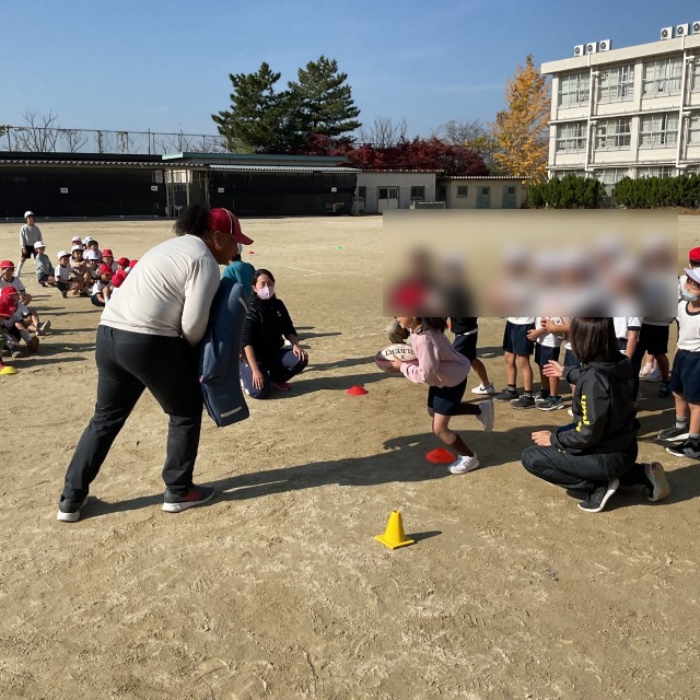 花園近鉄ライナーズのタウファさんに来校いただき、1年生にラグビーの出前授業を行なっていただきました。タウファさんはトンガ出身の元ラグビー選手で、日本代表チームでも大活躍されました。また、『日本人以上に日本人らしい魂を持っている』と言われた方です。