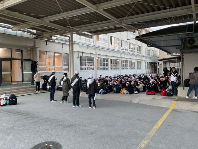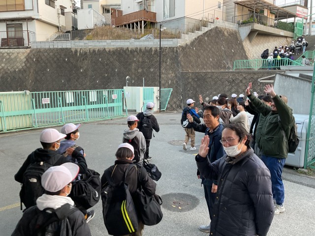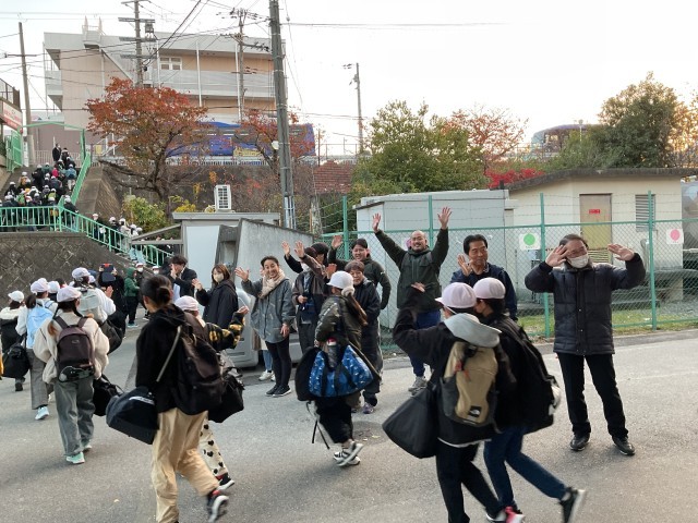 待ちに待った修学旅行当日。開門時間前に、すでに数名の児童が校門前に集まっていました。出発式を終え、先ほど予定通り出発しました。帯同しない大勢の先生方が見送ってくれました。