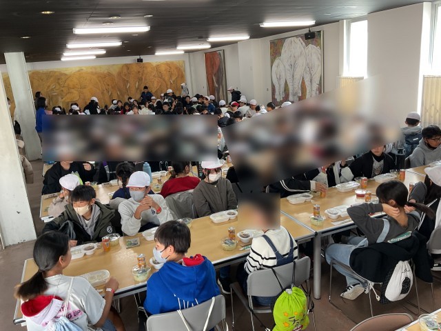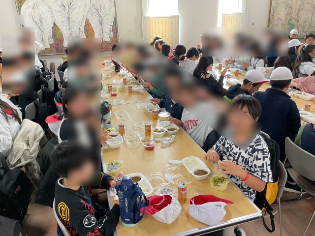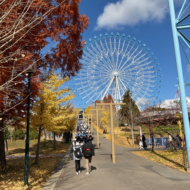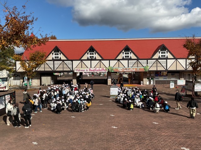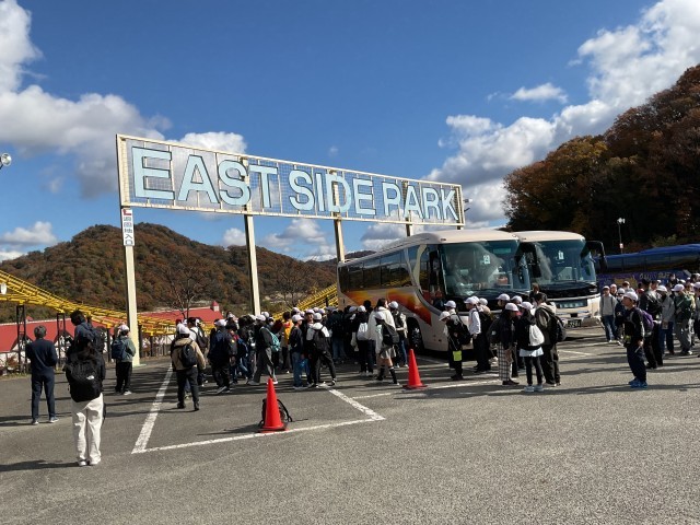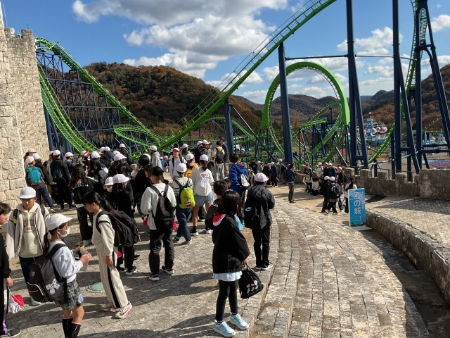 いよいよ遊園地エリアに入場です。少し動くと汗ばむ陽気となりました。赤や黄に色づく樹々と青空のコントラストが最高でした。子どもたちはまず、昼食を取ってフリータイムに向けての準備をしました。