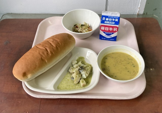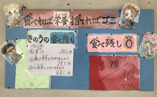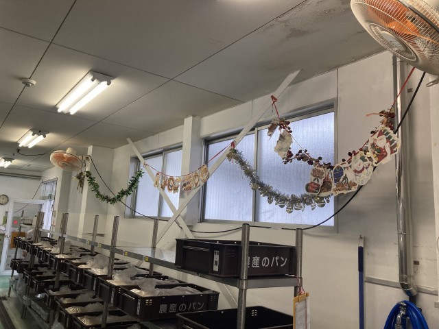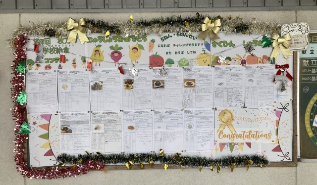調理場の掲示板には、学校給食コンテストの応募作品が貼られていました。今年は1人、入賞し、来年度の献立に採用されるかもしれません。来年度もたくさんの応募を期待しています。また、調理場内の通路沿いには、クリスマスの飾りが用意されていました。