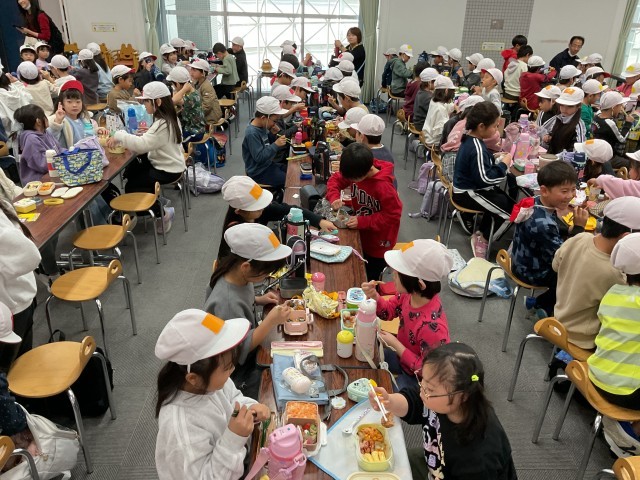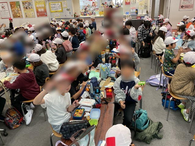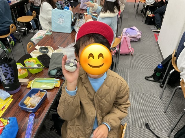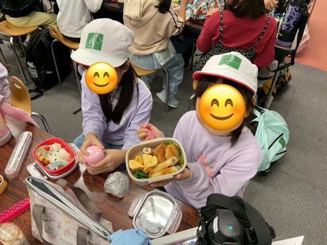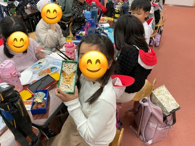 午前中の様子がまだアップしきれていませんが、その前に待ちに待った弁当タイムの様子です。色とりどりの弁当(キャラ弁)を前に、みんな笑顔でいっぱいです。