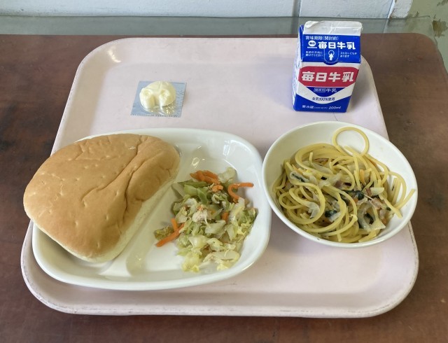 今日のおかずは豆乳スパゲティでした。校長は、児童が食べる前に検食を行います。今日のように麺類の献立の時には、麺が汁気を吸うことを計算して、検食時には少し硬めの状態で料理が出てきます。4時間目が終わって児童が給食を取りに来て食べる頃には、程よく柔らかくなるというわけです。調理員の方々は、そこまで計算して調理をしてくれています。