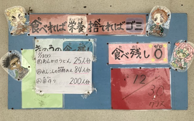 調理場前の掲示板に、3月までの新献立の紹介が追加されました。1・2月に市内の児童考案の献立も予定されています。