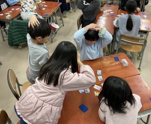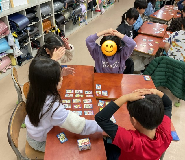 2年生がカルタをしていました。担任が札を読み始めるまで、子どもたちは両手を頭の後ろに組んで待つのがルールのようです。その目は真剣そのもので、札が読まれると思わず中腰になって札を探し始めます。札を取った子どもも取れなかった子どもも、楽しそうに取り組んでいました。