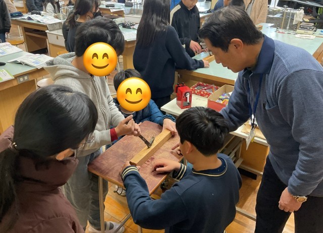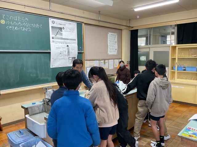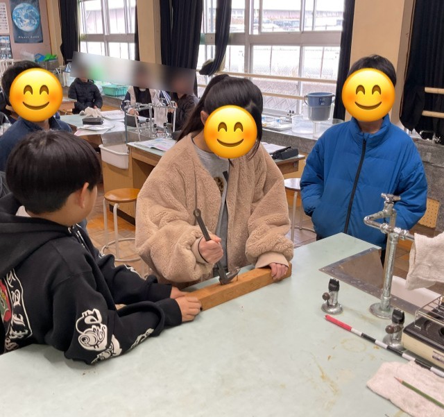 6年生が、理科の時間にてこの働きを学んでいました。板に打ちつけたくぎを、バールを使って抜きます。バールの握る位置を変えながら、どこを持てば釘を抜きやすいか試していました。
