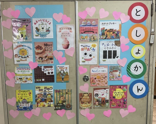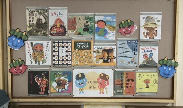 図書室前の掲示物が新しくなりました。来週から2月ということで、節分とバレンタインがテーマです。