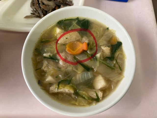 今日の大おかず(ちゃんこ)には魚型に型抜かれたにんじんが入っていました。栄養士さん・調理員さんが時々、いろいろな型抜きで一個一個、手作業でやってくれています。今日の魚型は、1年生が国語の教材で『スイミー』という小さな魚の話に合わせて用意してくれました。この話は、教科書に初めて載ってから約50年が経っていて、映画化もされた名作です。