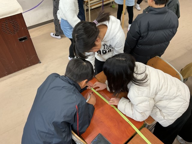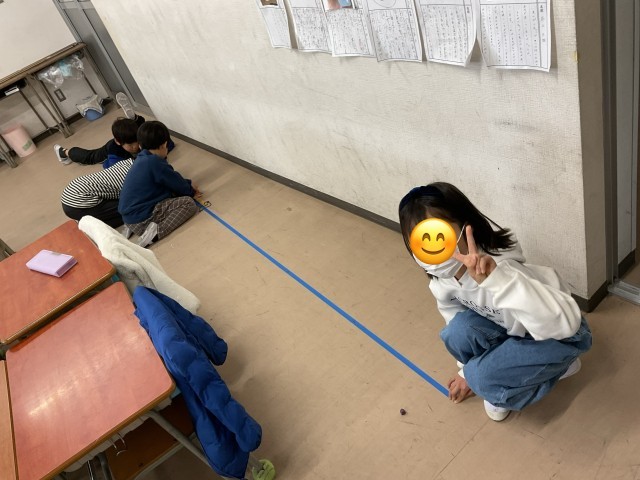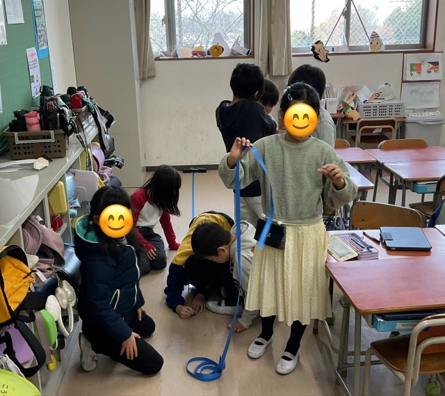 2年生が紙テープを使って、1mの竹尺で測れない長さを測っていました。紙テープを3m分切り取って、机の周りの長さや床から天井までの高さを測りました。紙テープを3mの長さに切る方法も様々で面白いなと感じました。