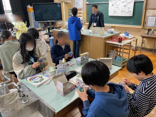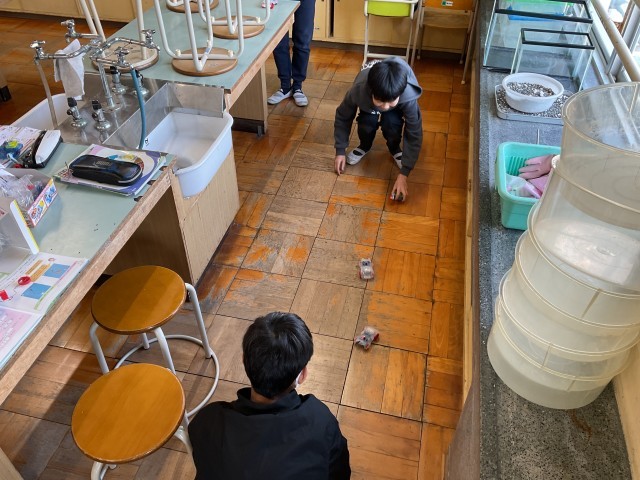 6年生が理科の時間に、教材を利用して発電・蓄電の仕組みを学びました。いわゆる手動の発電機を利用した自動車です。手回し発電機を何回も回して蓄電し、その電力で車を走らせます。想像以上に勢いよく走る車に、子どもたちは驚いてました。