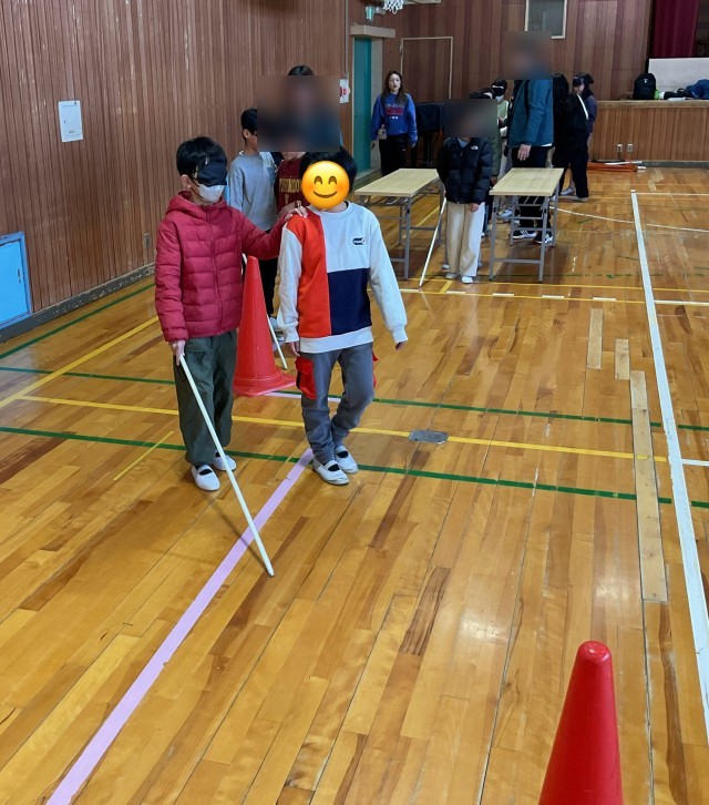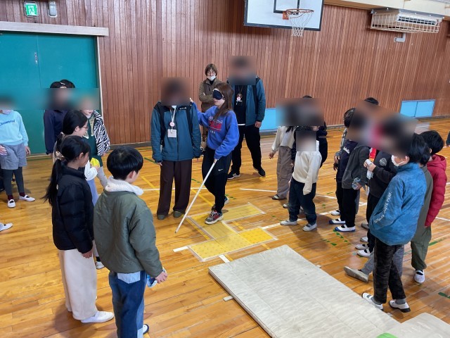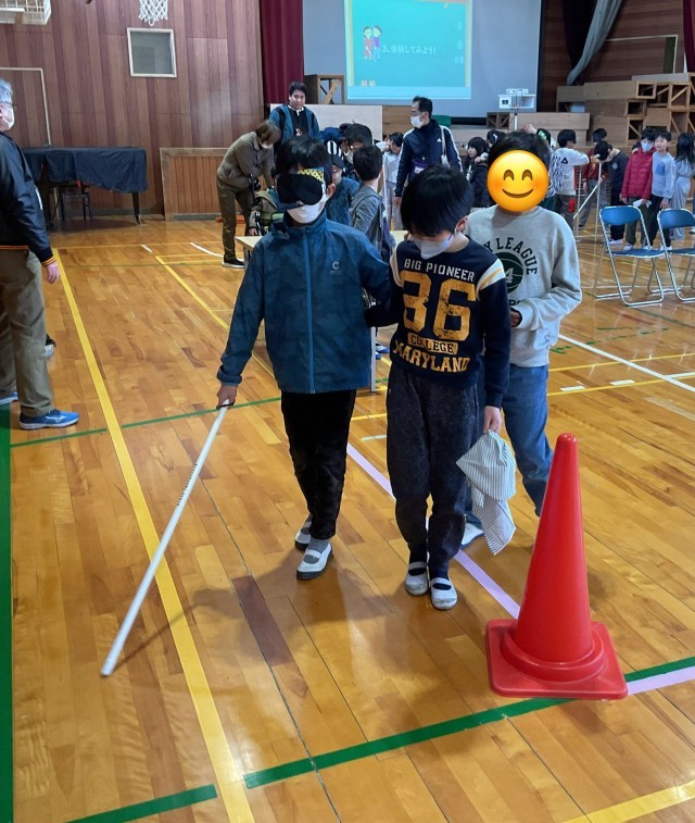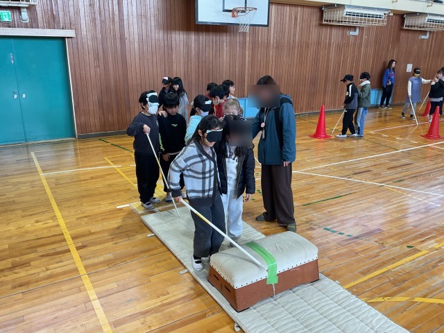 4年生がアイマスク・白杖体験をしました。体育館に障害物に見立てた机や跳び箱を並べ、そこをアイマスクをした児童が白杖を持って別の児童による先導で歩きました。普段使っている体育館で床は平らであるにも関わらず、ちょっとした障害物や段差がとてつもなく恐ろしく感じられるようでした。体験後、児童は『真っ暗で怖かった』と語っていました。この体験を通じて、子どもたちは白杖を持った人の気持ちを知ることができました。