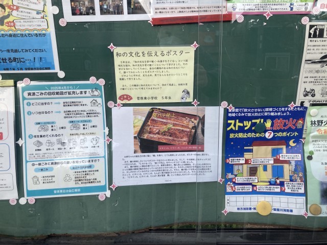 先月、5年生が作成した和のポスターを地域の掲示板に貼っていただく予定だとお伝えしましたが、そのうちの一枚が菅原東自治会集会所前に掲示されていました。他の5枚もどこかの掲示板に貼られていると思います。是非、探してみてください。掲示にご協力いただいた自治会の皆さん、ありがとうございました。