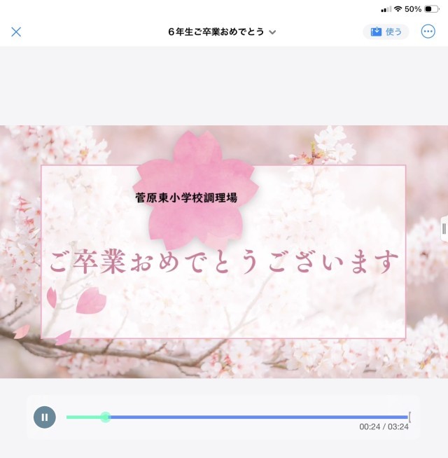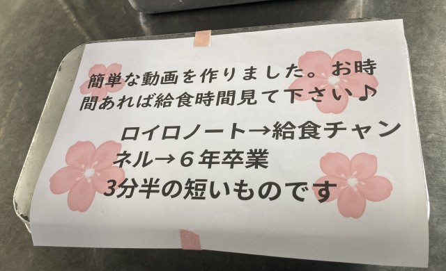 明日に卒業式を控え、6年生にとって今日は小学校生活最後の給食でした。特別献立ということで、子どもたちが大好きな唐揚げに加え、赤飯、みかんゼリーが提供されました。栄養士さん、調理員さんからは、卒業祝いの動画が送られました。