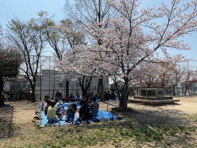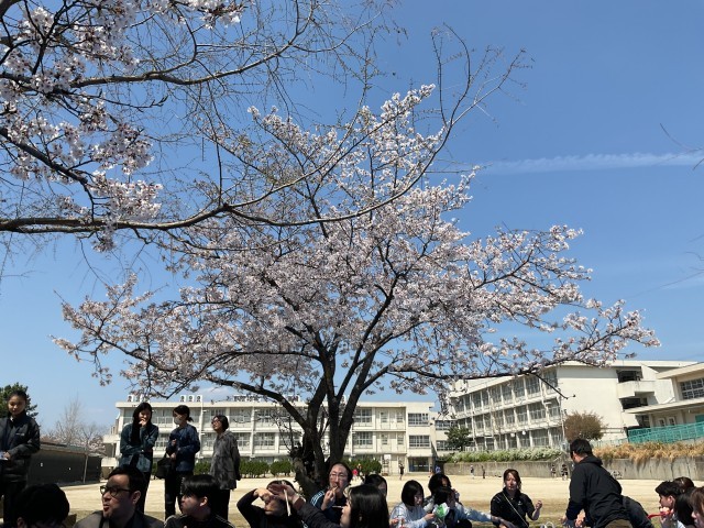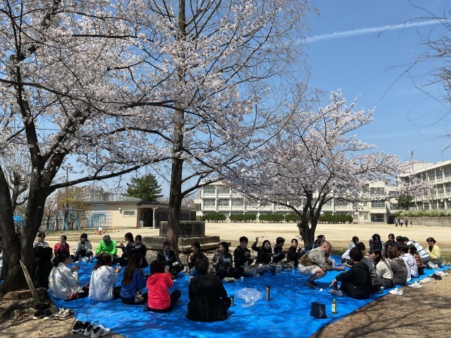 お花見ランチ 公開日 2026/04/03 更新日 2026/04/03 学校の様子 今日は朝から天気が良く、校庭の桜も満開です。そこで、急遽、職員参加のお花見ランチをすることにしました。突然の声掛けだったにも関わらず、ほぼ全員の職員が参加してくれました。用意していた大きめのブルーシート3枚が、職員でいっぱいになりました。大勢の転入者がいる中で迎えた新年度の3日目。青空の下で楽しい時間を過ごすことができました。 +1 いいね(0)