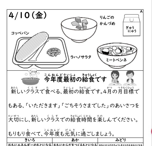 なお、1年生の給食開始日は15日です。