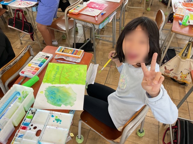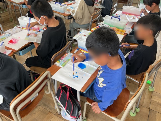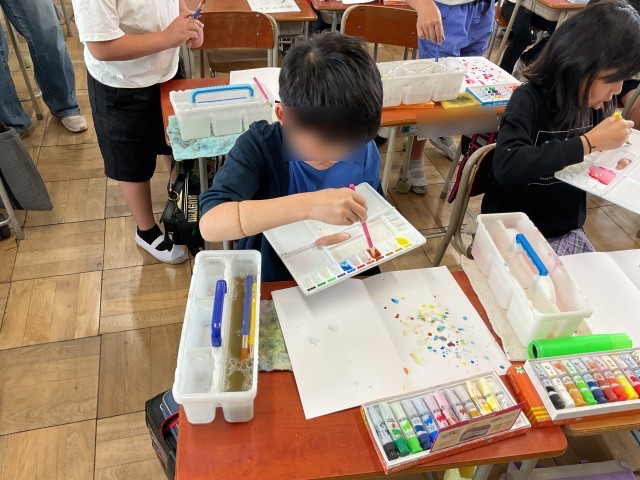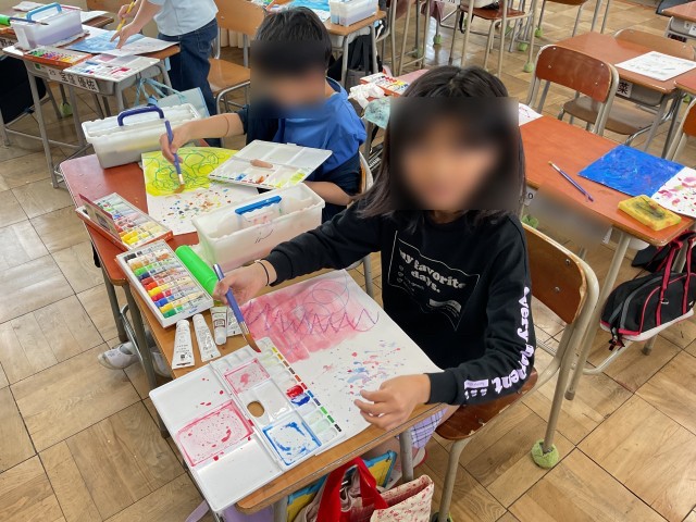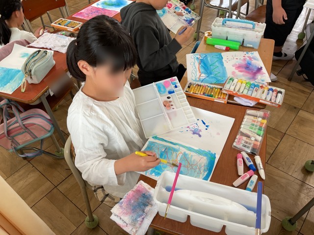 4年生の図画の時間の様子です。多めの水で溶いた絵の具を筆につけて、画用紙の上で振って模様をつけるドリッピングや、クレヨンで描いた模様の上から水性絵の具で色を塗るはじき絵を試していました。