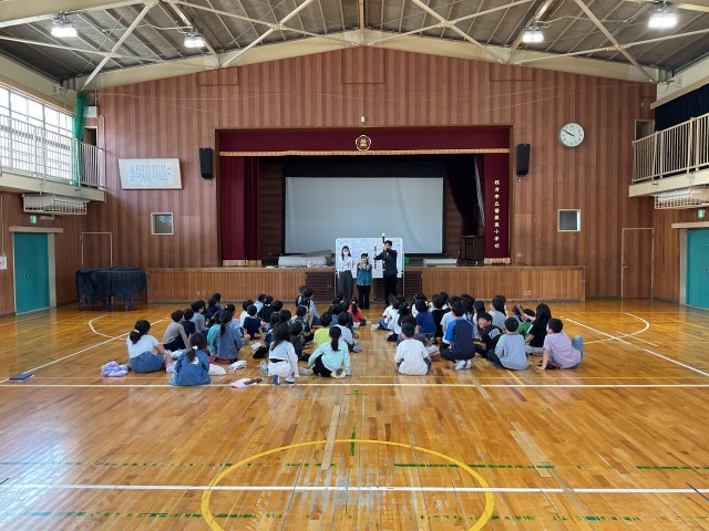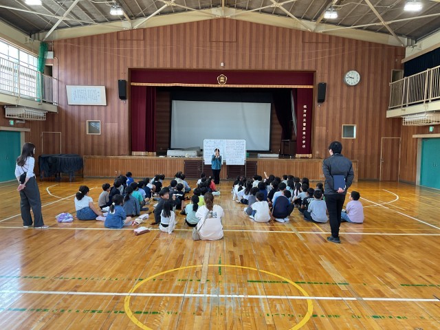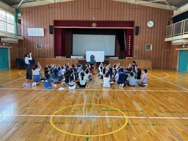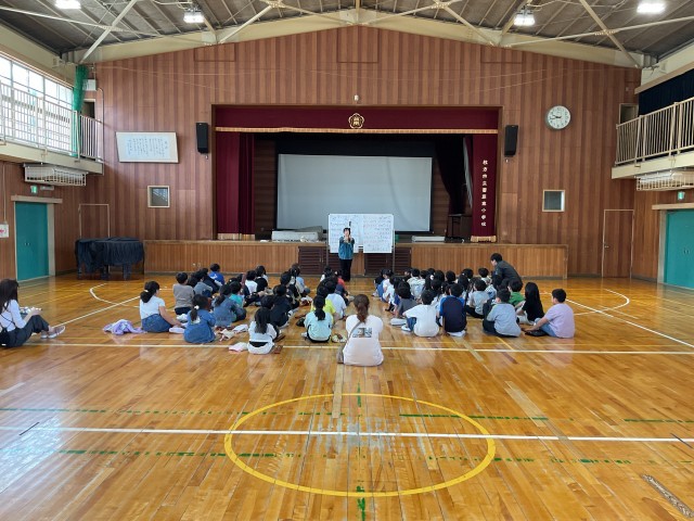 体育館で、外部講師をお招きして3年生に対するリコーダー講習会を行いました。一言で『リコーダー』といっても種類は様々で、小学生が使っているのは『ソプラノリコーダー』と言います。今日は、それ以外のリコーダーを5種類、紹介していただき、それぞれの大きさと音色の違いを学びました。また、それぞれのタイプのリコーダーでどこかで聴いたことがあるメロディーを奏でていただきました。