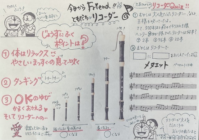 リコーダーの紹介後には、ドラえもんの歌の演奏を練習しました。
