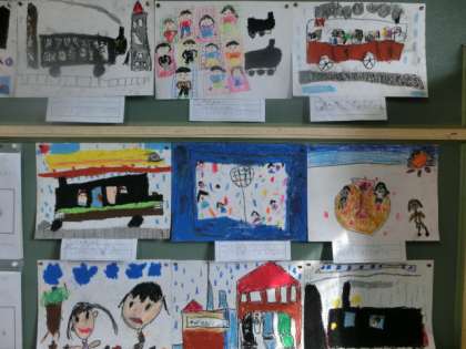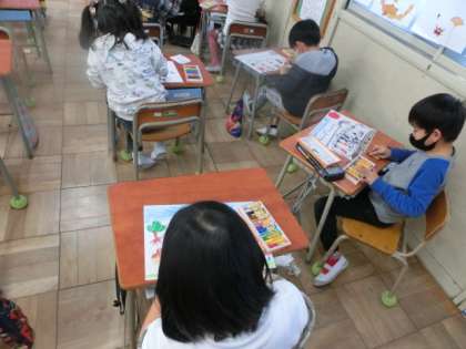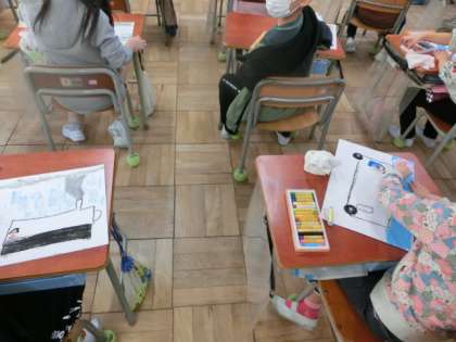 12月20日(月)5時間目、1年生のあるクラスでは、クレパスで2学期の思い出を絵で表していました。子どもたちの中には、運動会であったり、どんぐりひろいであったり、いろんなことを自分なりに思い出して、描いていました。