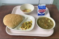 今日のメニューは、「キャベツととりだんごのスープ」、「ライスソテー」、黒糖パン、牛乳、みかんでした。