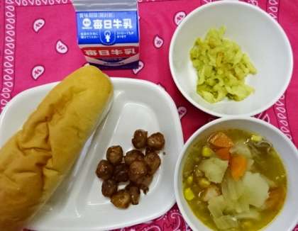 今日のメニューは、「スープ煮」、「どりだんごのケチャップあえ」、「キャベツのカレーソテー」、コッペパン、牛乳でした。