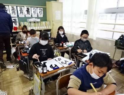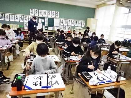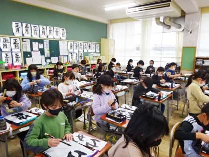 3年生の書写の授業の様子です。「ゆめ」という字を書いていました。習字のひらがなは、「曲がり」や「はらい」がむつかしいです。みんなていねいに練習していました。
