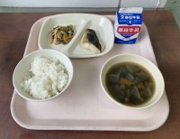 今日のメニューは、「マーボー豆腐」、「ささみとキャベツの炒め物」、ごはん、牛乳、ミニぶどうゼリーでした。デザートがつくと、子どもたちもうれしそうです。教室では、楽しそうに食べていました。