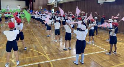 3年生の団体演技の練習風景です。小気味よく旗を振る姿が、見ていて気持ちよかったです。