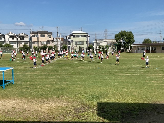 体育館ではしっかり踊れていましたが、運動場での立つ位置を確認しながら、動きも大きくの練習です。