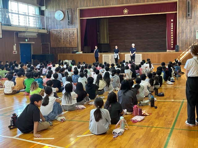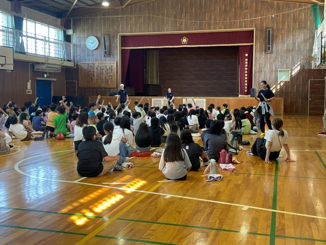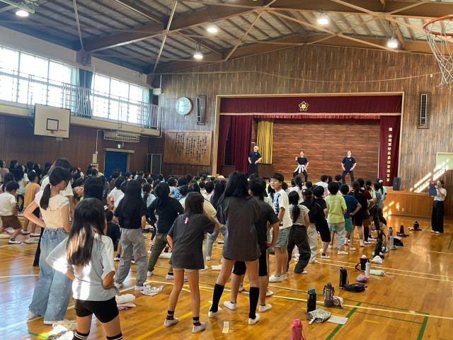 鑑賞する前に劇団に肩に来ていただき、「狂言」とはどんなものか、狂言の中での動物の表し方や人の歩き方、笑い方、怒り方など実際に一緒にやってみながら教えていただきました。
