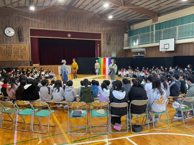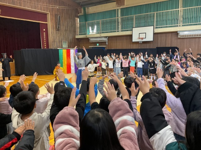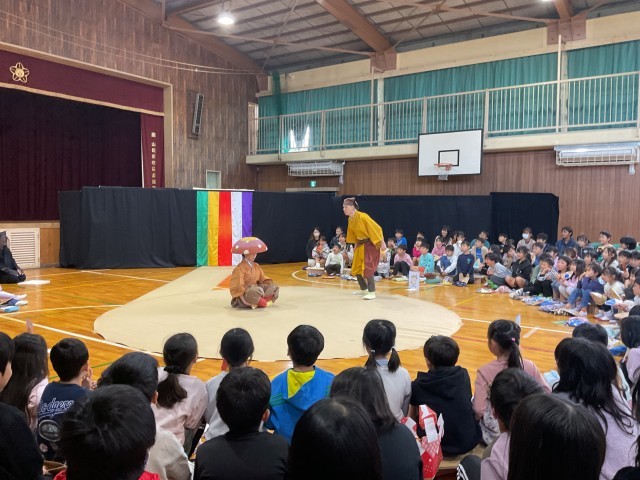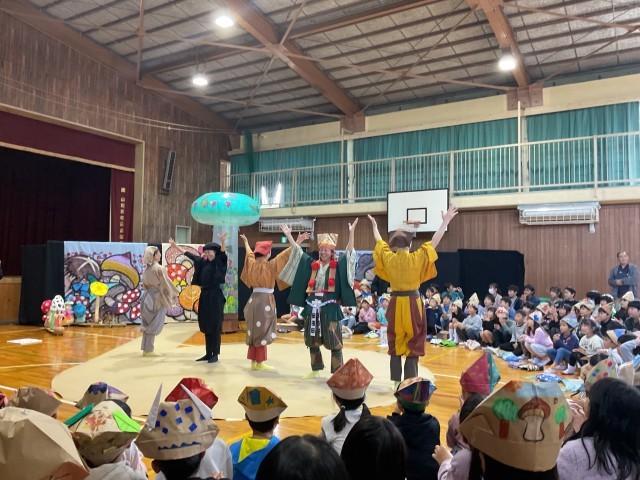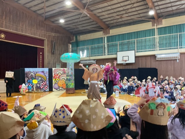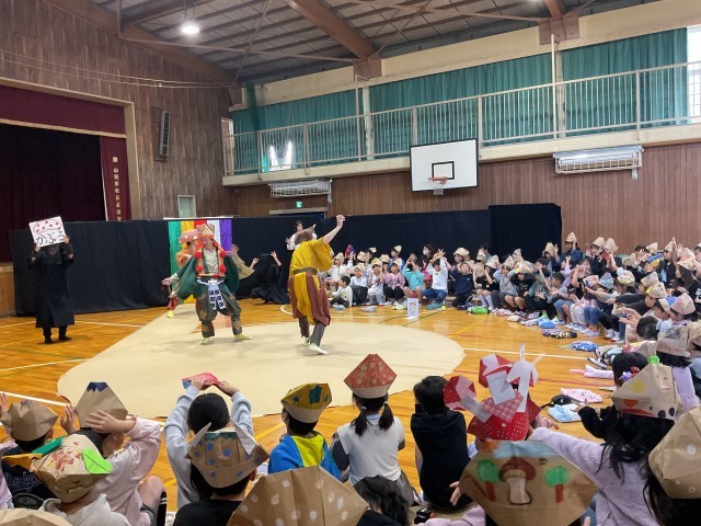 今年は「狂言」。伝統ある「狂言」とはどんなものかを教えてもらいながら、今の子どもたちにもわかりやすく、楽しめる内容になっていました。みんなで「きのこ体操」をしたり、や自分たちで作ったきのこ帽子をかぶってきのことなってお坊さんとの攻防に参戦したり、とても楽しく「狂言」に触れることができました。