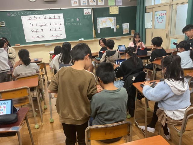 今日はアルファベットを指文字でクイズにしました。指でいろいろ試しながら、友だちと確認し合いました。上手にできたら、写真に撮ってもらってクイズの完成です。