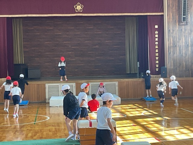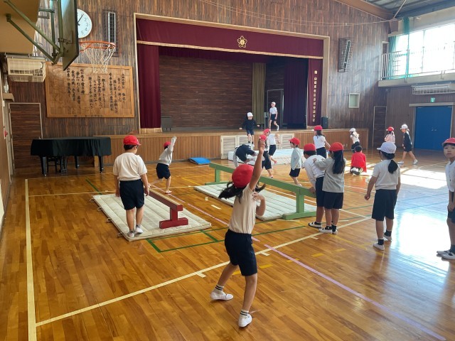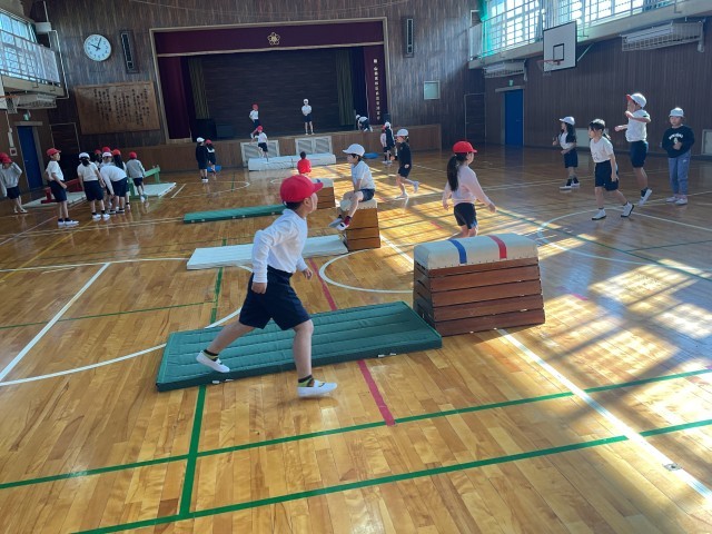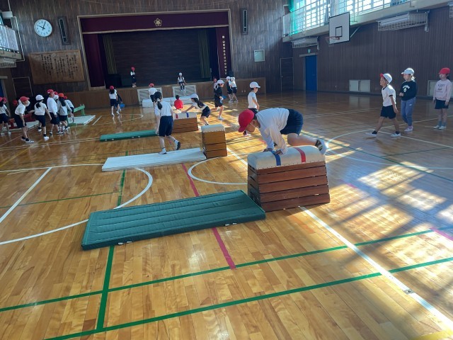跳び箱も3段、4段、半分の長さの跳び箱の3種類に分かれていて、それぞれ自分の課題、めあてによって自分が挑戦する跳び箱を選択していました。