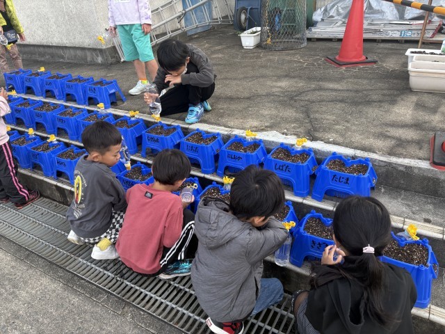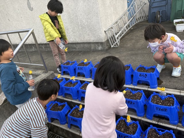 1年生が朝顔が終わった後の植木鉢にチューリップを植え、毎日、水やりを頑張っています。