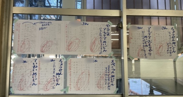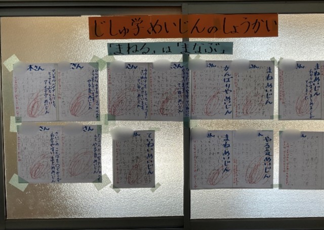 1年生はこの学習がとても大好きなようで「⚪︎⚪︎をやったよ」「△△調べたよ」と報告にきてくれます。みんなの頑張りを廊下にたくさん掲示しています。