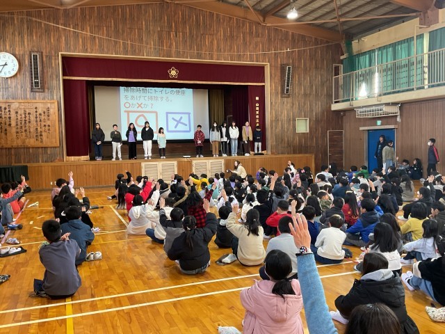 次は美化委員会から掃除の仕方について⚪︎×クイズで出題されました。ほとんどの人が正解していましたが、もう一度きちんと確認できました。清掃活動を頑張って、学校中をピカピカにしましょう。