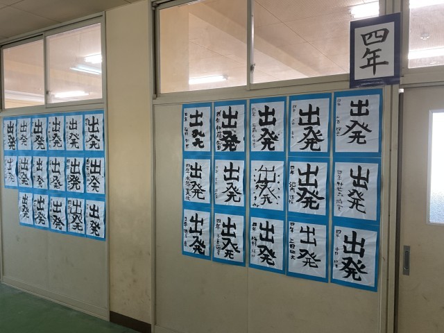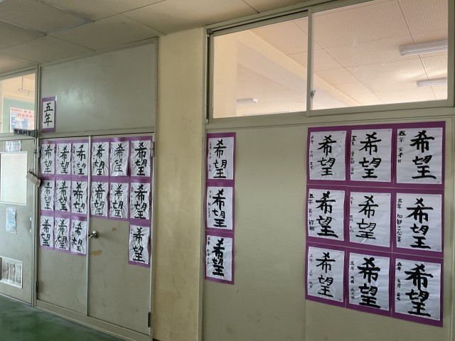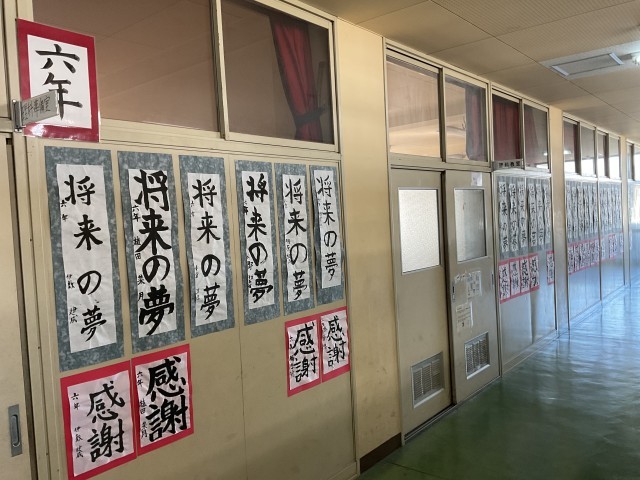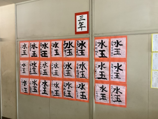 管理棟2階廊下で「書道展」として各学年の硬筆、毛筆の作品を展示しています。
