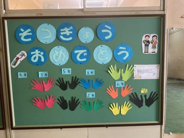 5・6年生の卒業式の練習も始まり、1〜4年生も明後日の送る会の練習に力が入っています。掲示物もお祝いをするものに貼られ代わり、学校中が卒業を祝う雰囲気になっています。