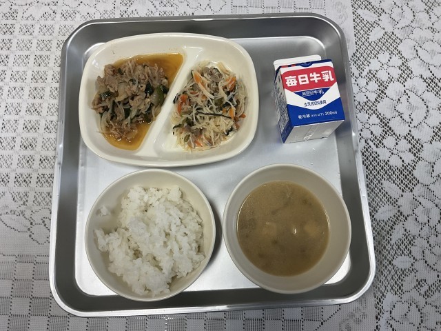 今日のメニューは、ぶたスタミナどん、ビーフンの炒め物、味噌汁、ご飯、牛乳